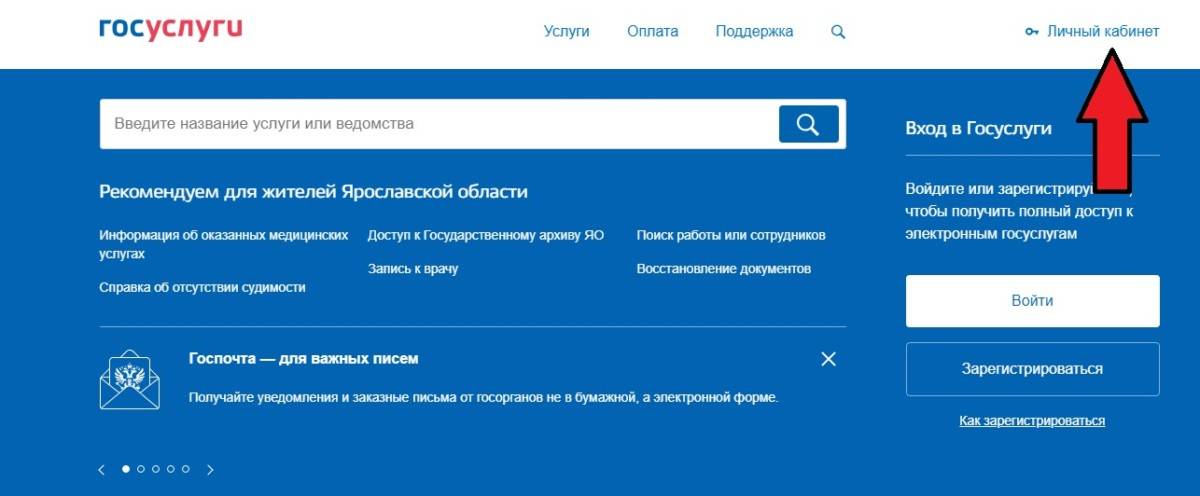 Шаг 1. Чтобы получить доступ ко всем услугам сайта, необходимо авторизоваться в системе. Для этого следует нажать клавишу «Личный кабинет» в правой части экрана.
