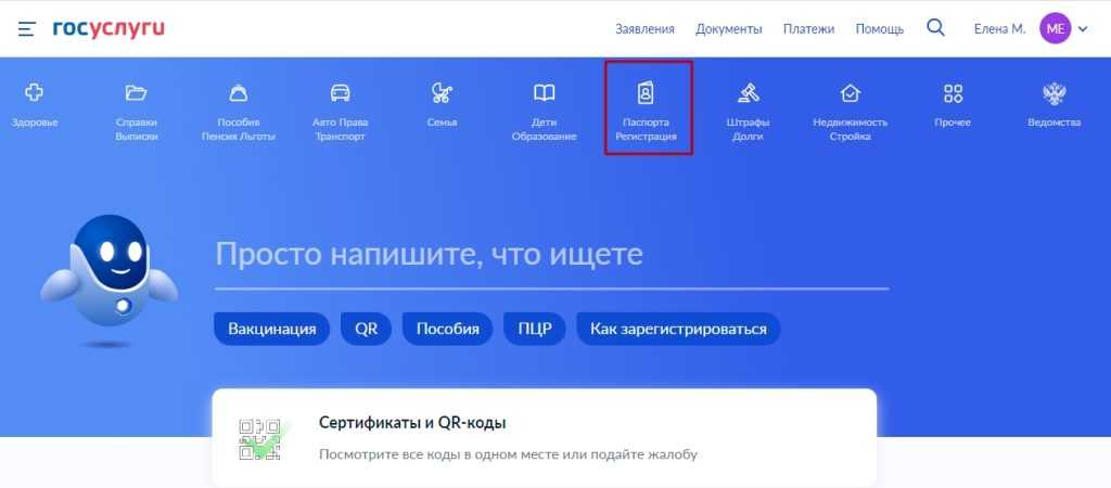 1. С главной страницы портала перейдите в раздел «ПАСПОРТА. РЕГИСТРАЦИЯ». В появившемся далее списке выберите «ЗАГРАНПАСПОРТ ГРАЖДАНИНЫ РФ».