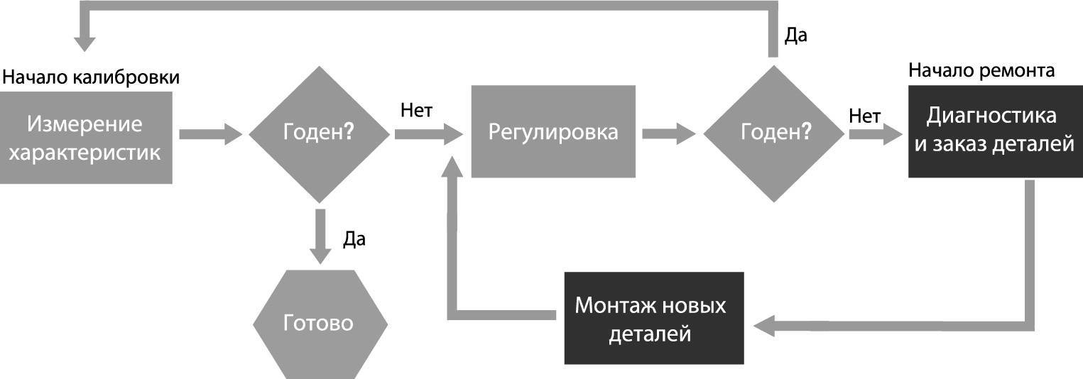 Многие, если не все, полагают, что когда они отдают прибор на калибровку, его настраивают «на середину интервала допуска». Это не так! Взгляните на процесс калибровки и ремонта, показанный на рис. 2.