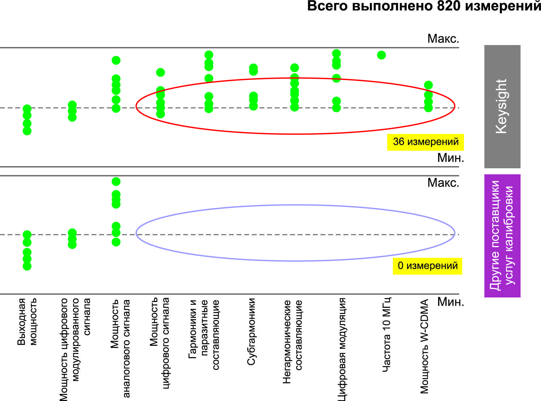 На рис. 4 в качестве сравнительного примера представлены измеренные характеристики векторного генератора ВЧ-сигналов Keysight N5182A MXG в ЦСМ Keysight и анонимного поставщика услуг по калибровке.