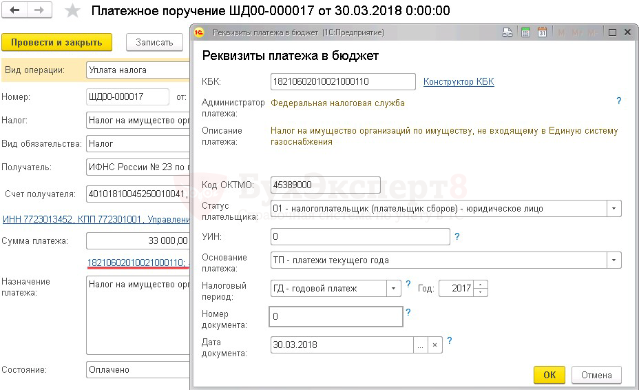 Платежное поручение на уплату налога на имущество