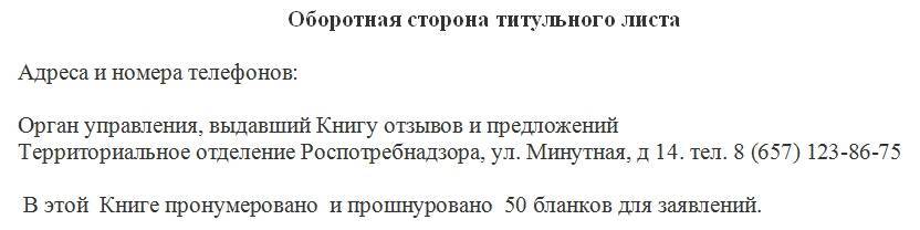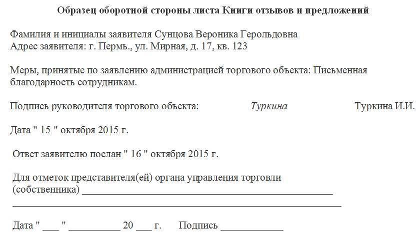 Здесь приводится пример заполнения книги посетителем. На лицевой стороне листа пишется собственно отзыв/предложение, с обязательным указанием его даты.