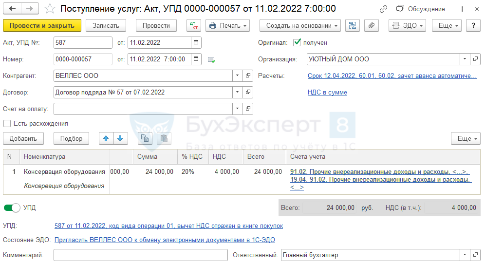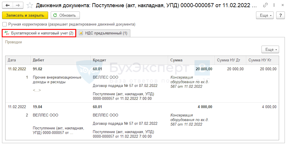 Если затраты на консервацию ОС выполнены подрядным способом, отразите их документом Поступление (акт, накладная, УПД) в разделе Покупки – Поступление (акты, накладные, УПД).