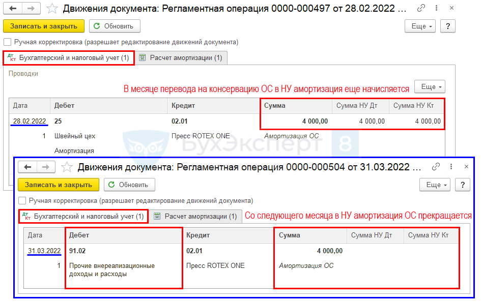 Со следующего месяца амортизация по консервированному ОС в НУ не будет начисляться в регламентных операциях при Закрытии месяца. В БУ — продолжает начисляться.