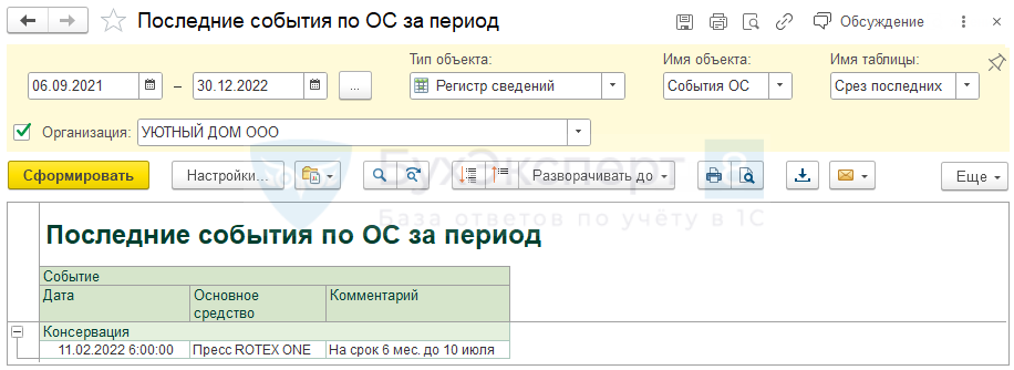 Далее перенесите такие ОС в отдельную папку в справочнике Основные средства. И контролируйте их стоимость с помощью стандартных отчетов по ОС. Например, ОСВ по счету 01, Анализ субконто Основные средства и т. д. После того как консервация закончится, перенесите эти ОС обратно в общую папку.