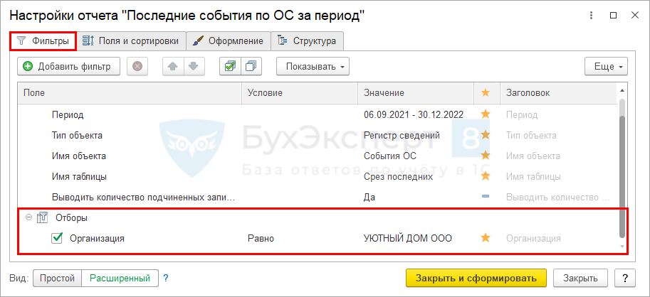 Сформируйте Универсальный отчет с названием, например, Последние события по ОС за период по регистру сведений События ОС. Выполните настройки, как на скрине выше.