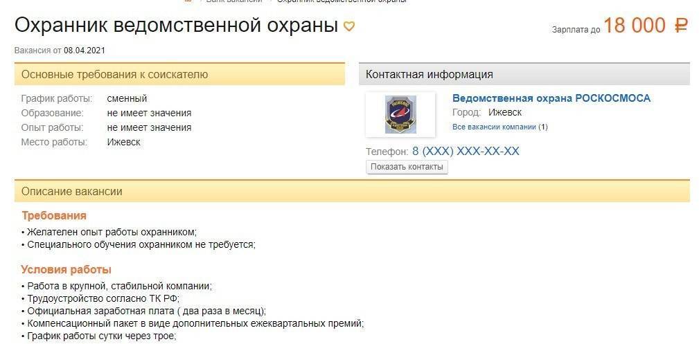 Охранники на объектах «Роскосмоса» в Ижевске могут рассчитывать на зарплату до 18 000 рублей в месяц. Никаких особых навыков, опыта и даже обучения от кандидатов на эту должность не требуется.