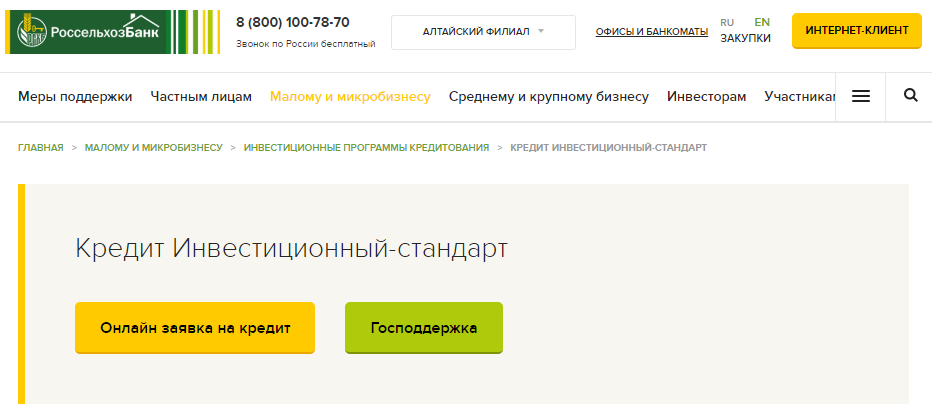 В банке есть много программ для кредитования начинающего бизнеса в сфере агропромышленного комплекса под бизнес-план. Например, «Инвестиционный-стандарт»: