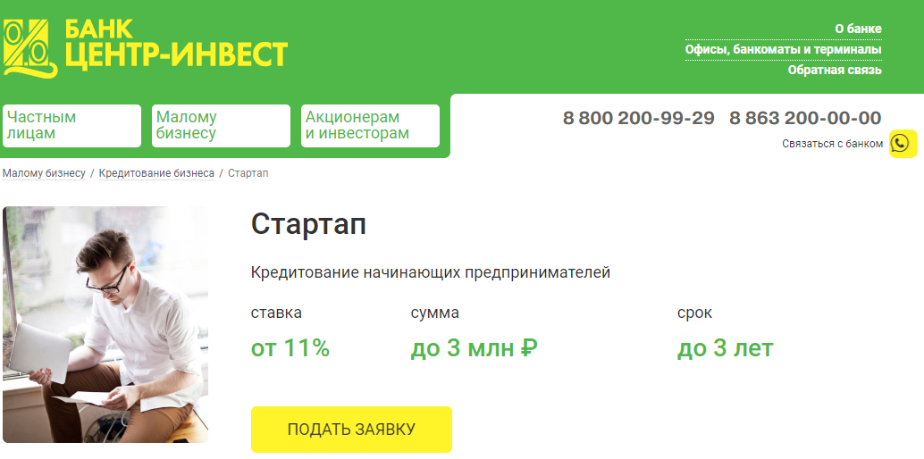 Взять кредит на стартап под бизнес-план можно в банке «Центр-Инвест». Условия кредитования следующие: