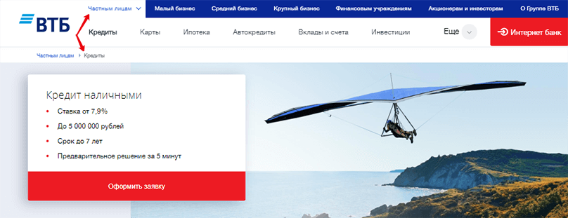 Как взять в ВТБ банке кредит наличными или на карту физлицам