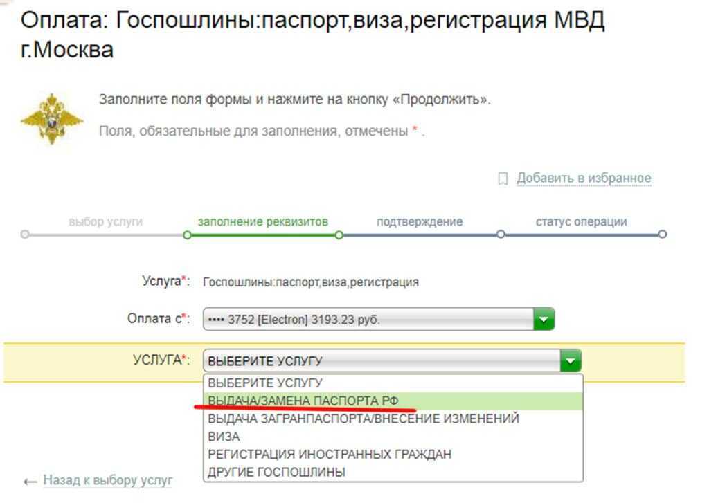 В новом окне в поле «Услуга» укажите «выдача/замена паспорта РФ».