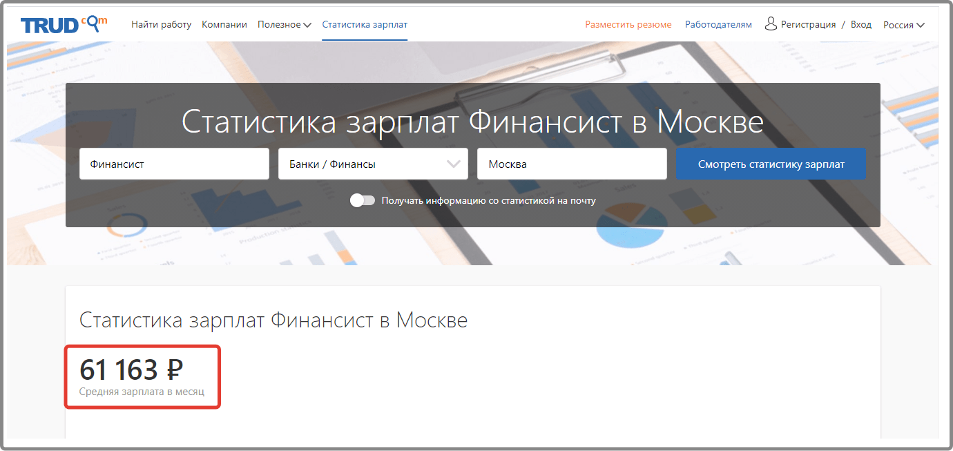 Портал по трудоустройству TRUD.com назвал среднюю заработную плату в финансовой сфере. В Москве в апреле 2021 года она составила 61 163 рубля: