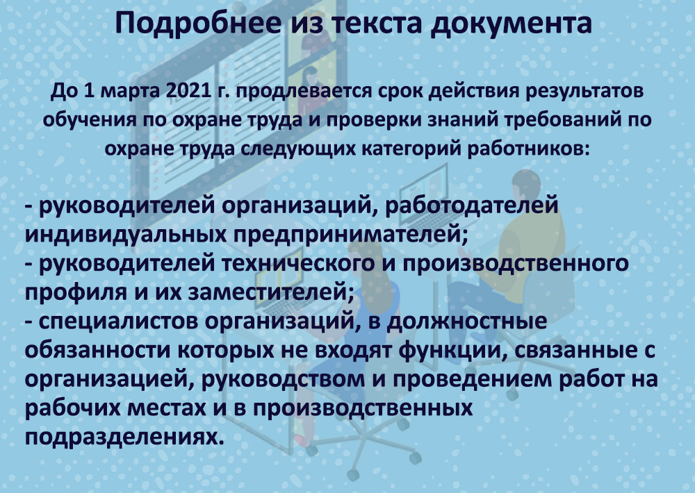 Также проект продлевает срок действия результатов обучения по охране труда некоторых работников до 01.03.2021.