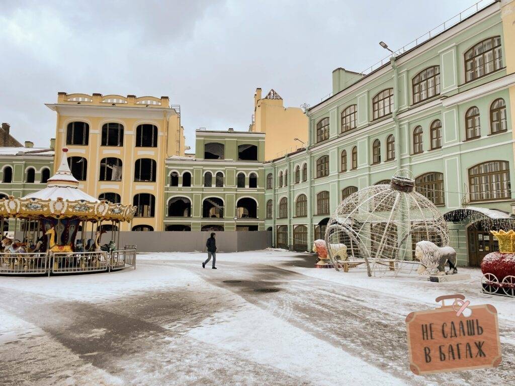 «Двор Гостинки» — место новое. Лишь в 2021 году внутреннюю территорию Гостиного двора открыли для свободного посещения. Открыли, но ничего особенного больше не сделали. Летом здесь было несколько заведений, продающих еду и напитки. Гости сидели на улице на качелях под кронами деревьев. Зимой такой формат совсем не подходит для снежного и холодного Санкт-Петербурга, но зимние развлечения администрация так и не придумала. Здесь можно увидеть несколько скупых украшений на новогоднюю тематику, украшенную елку и карусель, в основном простаивавшую, нежели работающую.