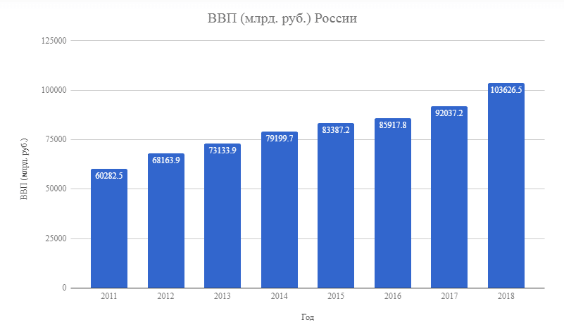 Что касается ВВП 2018 г., его показатель значительно вырос, по сравнению с предыдущими годами. Национальная валюта укрепилась, темп роста ВВП составил 102,3%. Его величина достигла 103876 млрд. руб.