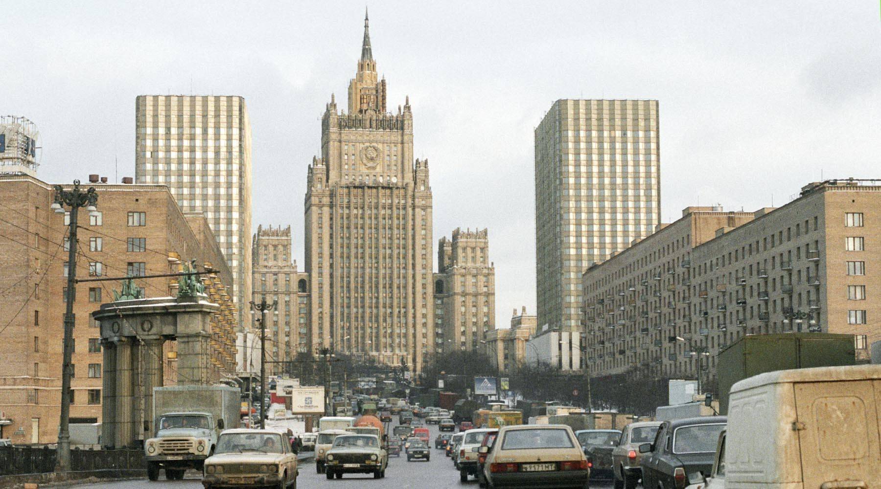 - Вид с Бородинского моста на Смоленскую площадь и здание Министерства иностранных дел РФ, 1995 г