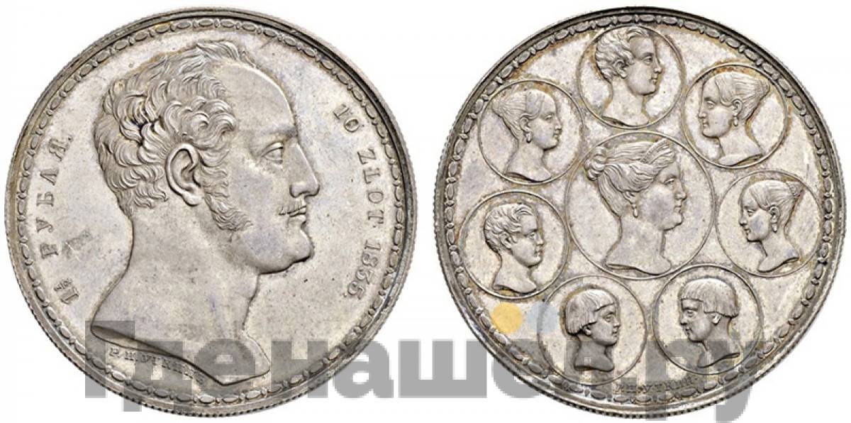 Материал: серебро, Вес: 30,91 грамма, Диаметр: 40 мм, Гурт: рубчатый. Серебряные рубли с профилем Николая I в ряду имперских памятных выпусков крайне редки, что сразу причисляет их к дорогим монетам царской эпохи. В их числе и Семейный рубль. Название является не совсем точным, так как номинал здесь необычный 1½, рубля / 10 злотых (в то время монеты с двойным номиналом чеканили для хождения в Царстве Польском). У этого рубля интересная история. По решению Егора Францевича Канкрина, занимавшего в то время пост министра финансов, к 10-летию со дня вступления государя на престол следовало отчеканить юбилейный рубль. За образец взяли талер с изображениями короля Людвига I и его семейства. Талантливый гравёр Павел Петрович Уткин в быстром темпе вырезает на штемпелях профиль императора (аверс) и портреты его жены и детей (реверс). Николай I, получивший новенький рубль 6 декабря на тезоименитство (день памяти Святого, в честь которого назван человек), в целом остался доволен, однако заметил: &hellip,сходство есть в старших двух дочерях и в старшем сыне, но жена похожа на покойную матушку. Пришлось Уткину дорабатывать портреты императорской семьи, но изменённый вариант вышел уже с другой датой. Нумизматы расходятся во мнении, в каком количестве отчеканена первая партия, однако указываются значения от 30 до 40 экземпляров. Один из них, ранее пребывавший в коллекции Вирджила М. Брандта, был реализован аукционом Sincona AG за 1 100 000 швейцарских франков (71 364 920 рублей по курсу на ту дату). Любой из юбилейных Семейных рублей, которые сейчас хранятся в лучших музеях мира, представляет не только высокую нумизматическую, но и большую историческую ценность.