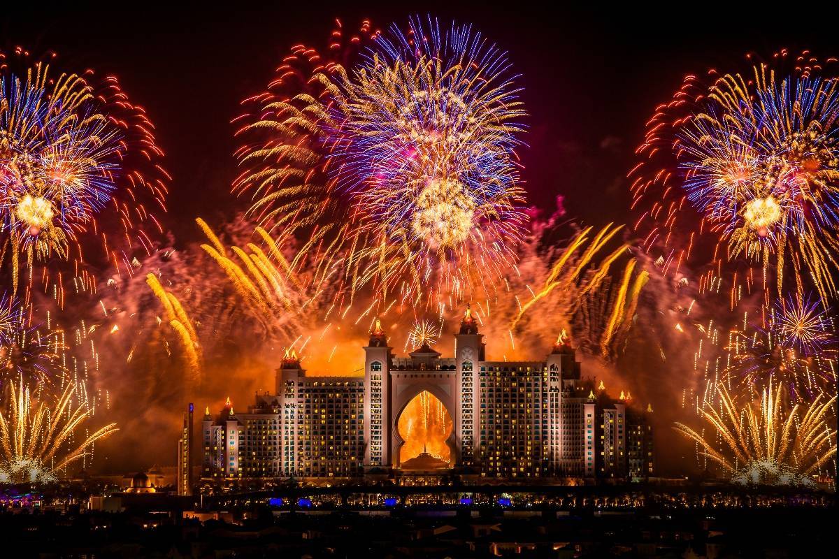 На Новый год в Эмиратах самые грандиозные салюты пускают с небоскреба Бурдж-Халифа, а также над островом Пальм Джумейра из отеля Атлантис. Отмечать Новый год в Эмиратах молодежь предпочитает в барах, ресторанах и ночных клубах, где по случаю праздника играют знаменитые музыканты, артисты и диджеи с мировым именем. Стоит только отметить, что алкоголь в Эмиратах продают только лицам, достигшим 21 года, а в некоторых заведениях – 25 лет.