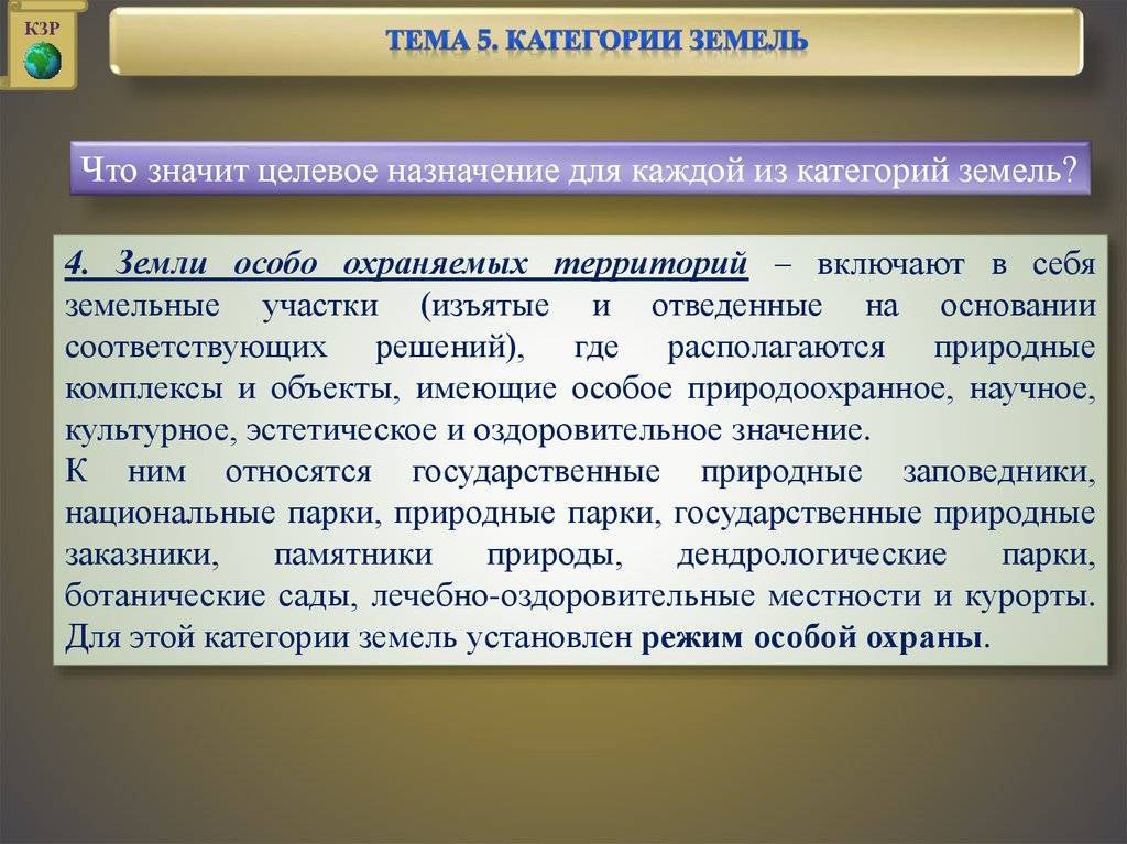 При распределении земельных участков на перечисленные категории законодатель преследовал цель исключения нецелевого использования участков, сохранения изначальных природных свойств земли и ее первоначальные характеристики.