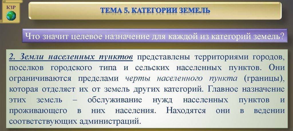 Для целевого назначения земель важно соответствовать конкретной указанной выше категории земель. Исходя из этого, во время обозначения целевого назначения земельных участков или земель они получают соответствующую категорию