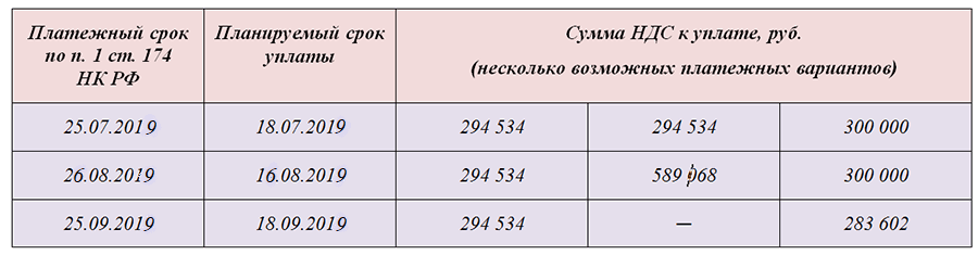 - Каждый очередной срок уплаты НДС за 2 квартал 2019года планировался на дату, предшествующую крайнему платежному сроку (не менее чем за 7 дней).