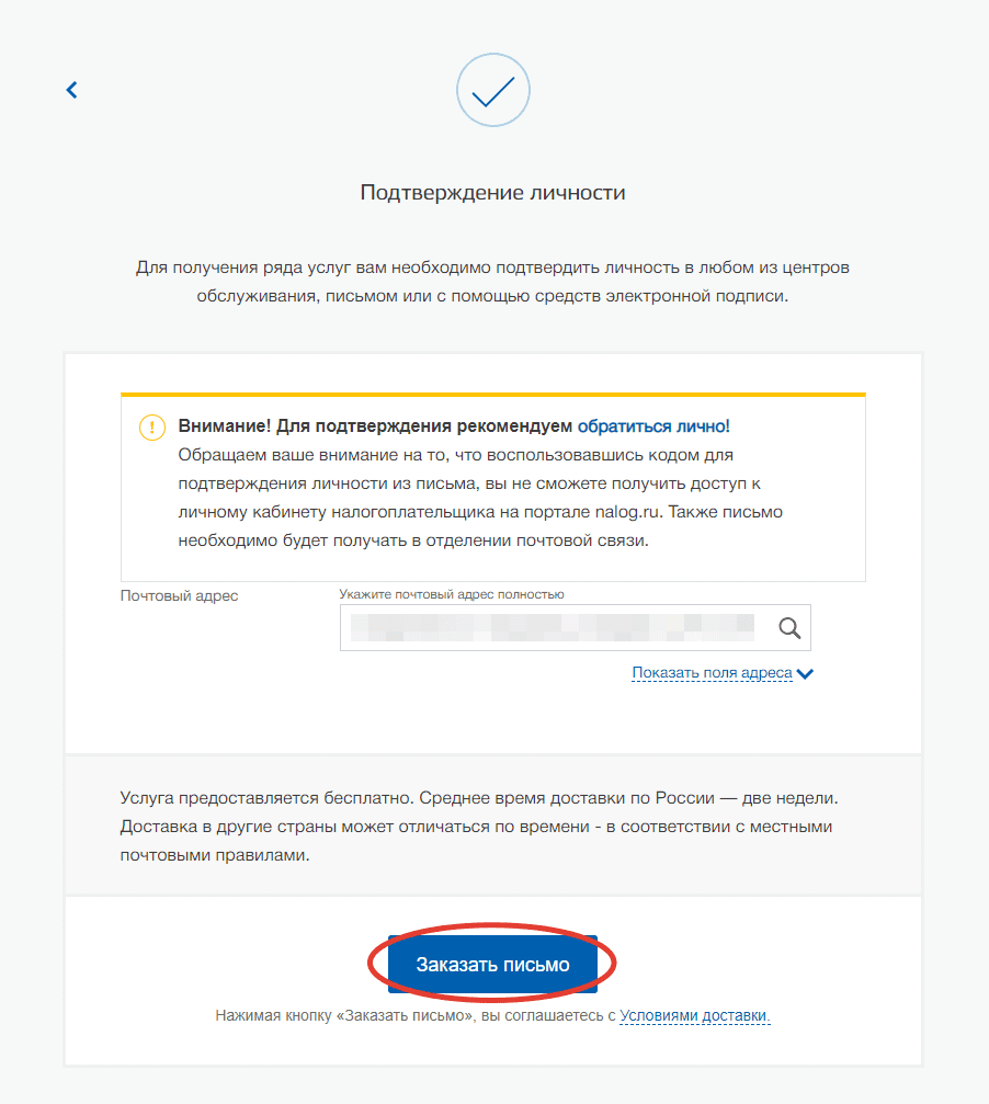 На странице персональных данных нужно нажать «Подтвердить личность Заказным письмом». Вам потребуется указать адрес, куда придет извещение.