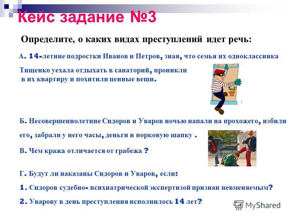 Кейс задание 3 Определите, о каких видах преступлений идет речь: А. 14- летние подростки Иванов и Петров, зная, что семья их одноклассника Тищенко уехала отдыхать в санаторий, проникли в их квартиру и похитили ценные вещи. Б. Несовершеннолетние Сидоров и Уваров ночью напали на прохожего, избили его, забрали у него часы, деньги и норковую шапку. В. Чем кража отличается от грабежа ? Г. Будут ли наказаны Сидоров и Уваров, если : 1. Сидоров судебно – психиатрической экспертизой признан невменяемым ? 2. Уварову в день преступления исполнилось 14 лет ?