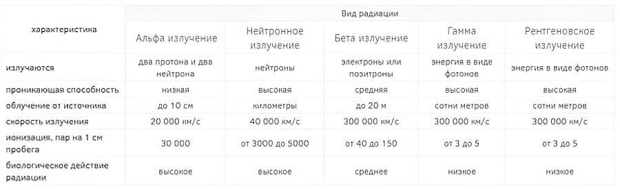 Альфа-излучение, бета и нейтронное представляют собой облучение частицами. Гамма и рентгеновское — это электромагнитное излучение.