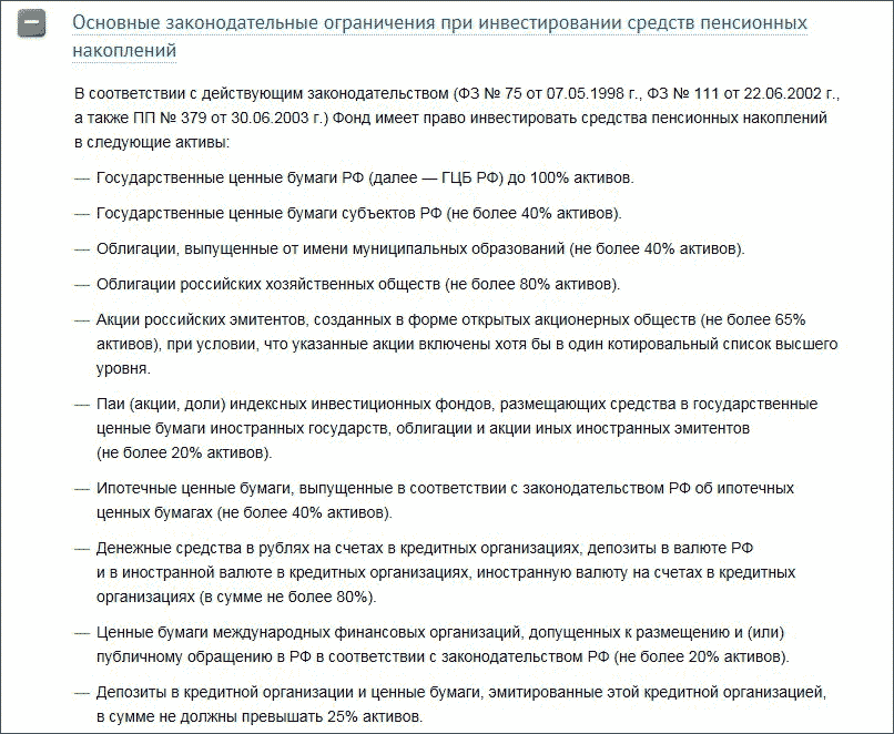 - его деятельность контролирует государство. Она организована сообразно указаниям постановления правительства РФ «Об инвестировании накопительной части трудовой пенсии», поэтому он не работает с финансовыми инструментами, которые вызывают сомнения, вкладывает средства в акции нескольких компаний;