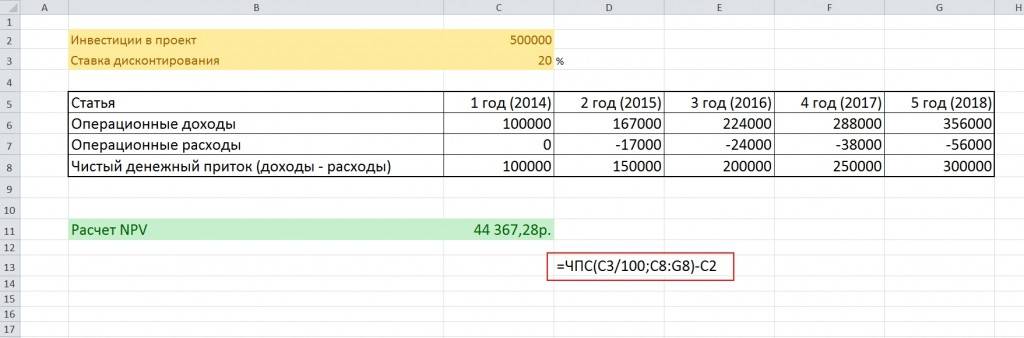 В «Microsoft Excel» есть формула, которая рассчитывает чистую приведенную стоимость. Для этого вам нужно знать ставку дисконтирования (указывается без знака «проценты») и выделить диапазон чистого денежного потока. Вид формулы такой: = ЧПС (процент; диапазон чистого денежного потока) — инвестиции.