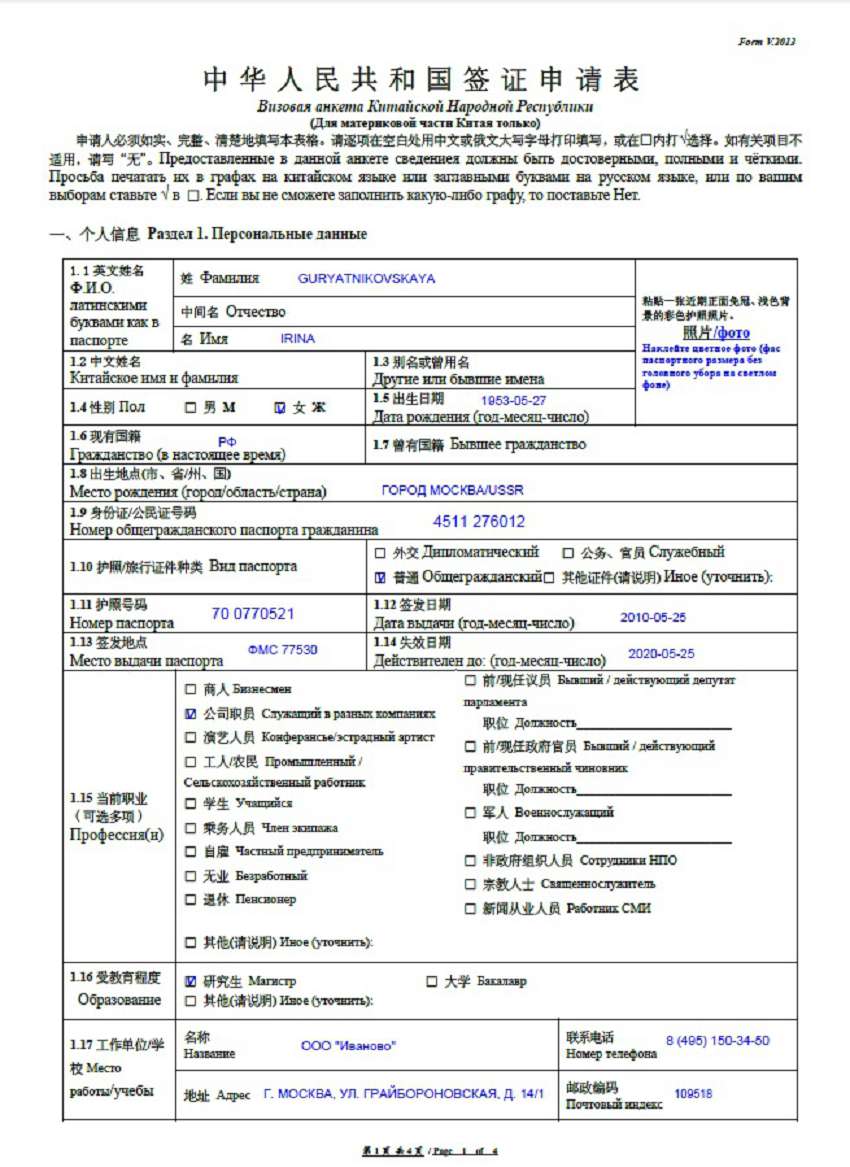 - заявительная анкета формы V.2013 (можно получить и заполнить в консульстве при подаче остальных документов или заранее скачать на сайте китайского посольства в Республике Беларусь);