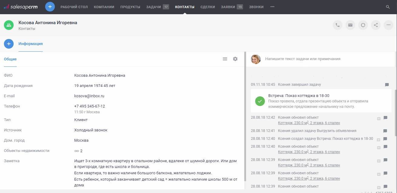 Кликнув на имя клиента, вы откроете карточку, в которой хранятся его контакты, запросы на объекты, отметки о том, какие объекты он смотрел и почему от них отказывался. Риэлтор может указать какие-то индивидуальные особенности клиента, например, взрывной характер или дотошность. Это поможет ему быстро сориентироваться, как разговаривать с клиентом, как готовиться к встрече.