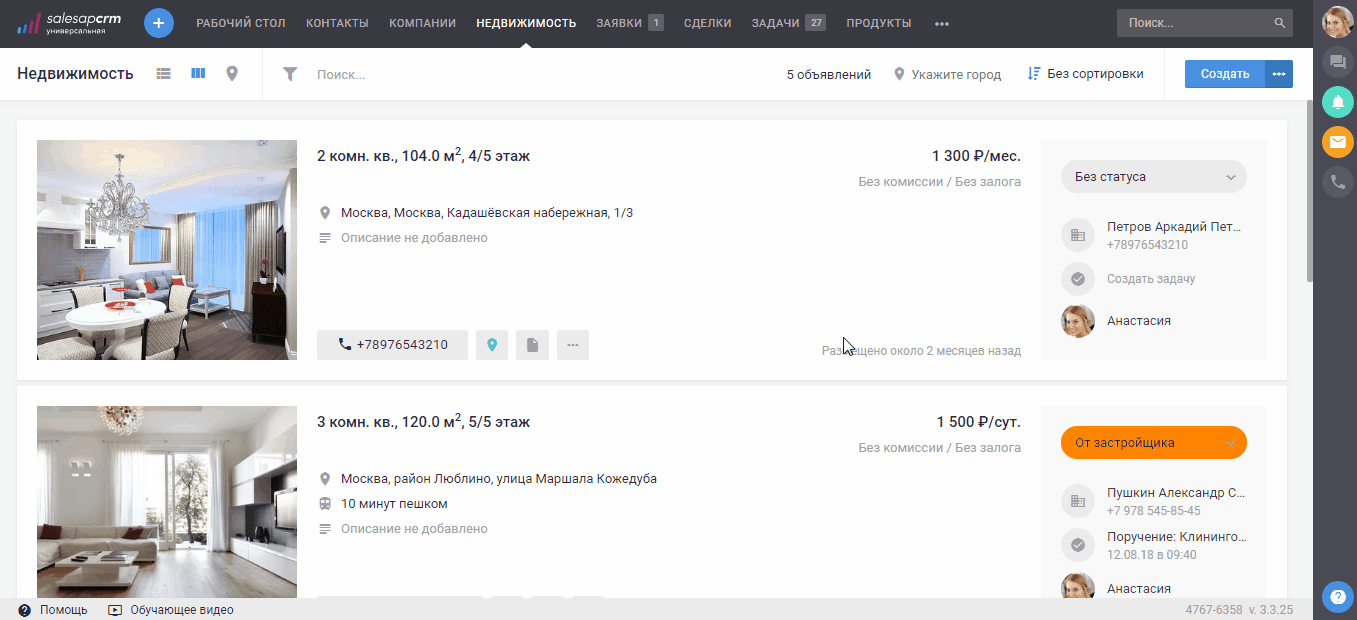 Давайте посмотрим ее полезный функционал на примере одной из риэлторских систем SalesapCRM.