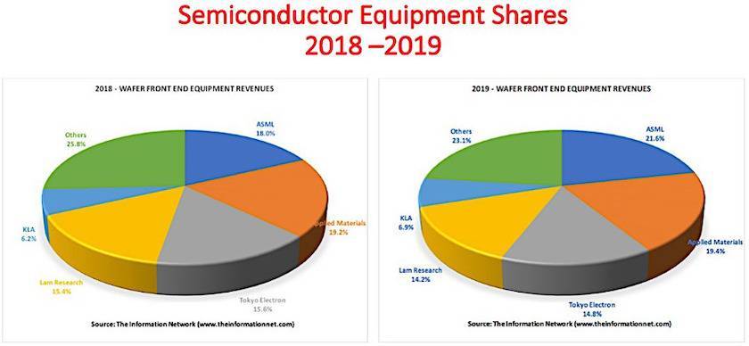В 2018 году на Applied Materials приходилось 19,2% рынка оборудования для производства чипов, тогда как в активе ASML было около 18%.