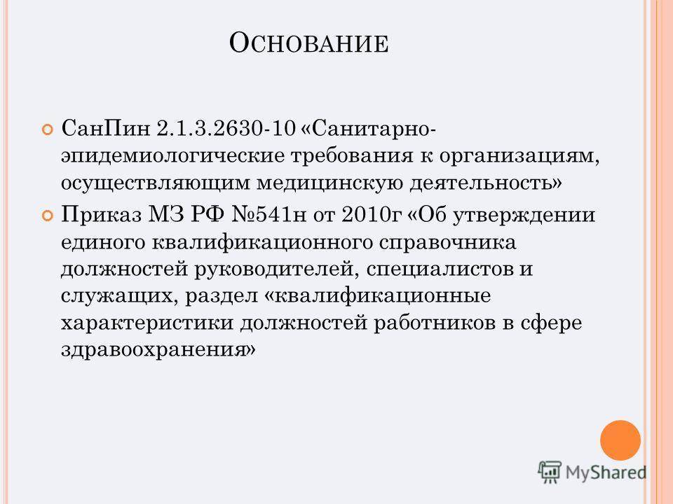 О СНОВАНИЕ СанПин «Санитарно- эпидемиологические требования к организациям, осуществляющим медицинскую деятельность» Приказ МЗ РФ 541н от 2010г «Об утверждении единого квалификационного справочника должностей руководителей, специалистов и служащих, раздел «квалификационные характеристики должностей работников в сфере здравоохранения»