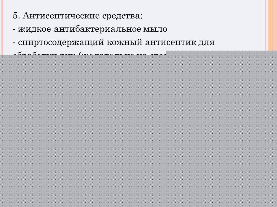 5. Антисептические средства: – жидкое антибактериальное мыло – спиртосодержащий кожный антисептик для обработки рук (желательно на этаноле так, как это сокращает время обработки) – спиртосодержащий кожный антисептик с красителем для обработки операционного поля