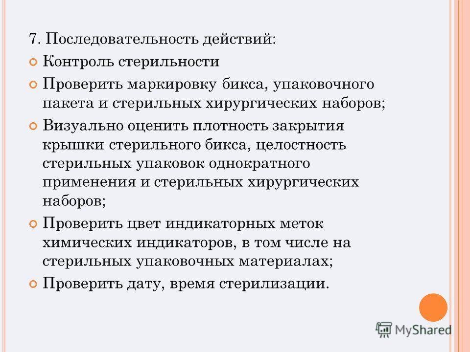 7. Последовательность действий: Контроль стерильности Проверить маркировку бикса, упаковочного пакета и стерильных хирургических наборов; Визуально оценить плотность закрытия крышки стерильного бикса, целостность стерильных упаковок однократного применения и стерильных хирургических наборов; Проверить цвет индикаторных меток химических индикаторов, в том числе на стерильных упаковочных материалах; Проверить дату, время стерилизации.