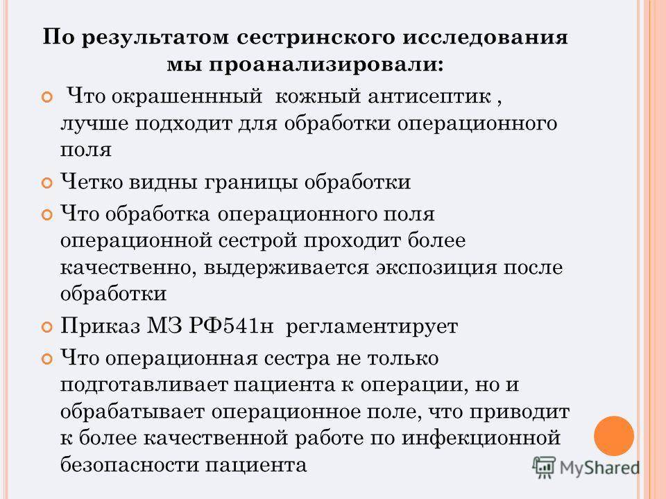 По результатом сестринского исследования мы проанализировали: Что окрашеннный кожный антисептик, лучше подходит для обработки операционного поля Четко видны границы обработки Что обработка операционного поля операционной сестрой проходит более качественно, выдерживается экспозиция после обработки Приказ МЗ РФ541н регламентирует Что операционная сестра не только подготавливает пациента к операции, но и обрабатывает операционное поле, что приводит к более качественной работе по инфекционной безопасности пациента
