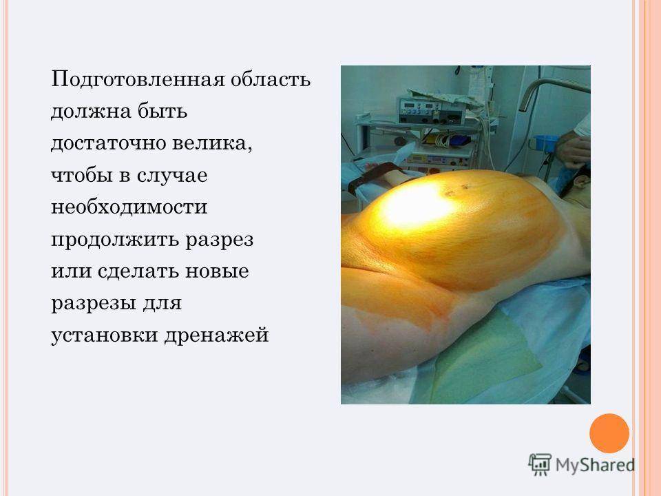 Предварительная подготовка места предполагаемого разреза (операционного поля) начинается накануне операции и включает общую гигиеническую ванну, душ, смену белья, сбривание волос сухим способом непосредственно в месте операционного доступа (при плановых операциях не ранее 1-2 часов до хирургического вмешательства, дабы избежать инфицирования возможных экскориаций и ссадин госпитальными штаммами патогенных микроорганизмов). После сбривания волос кожу протирают 70% раствором спирта.