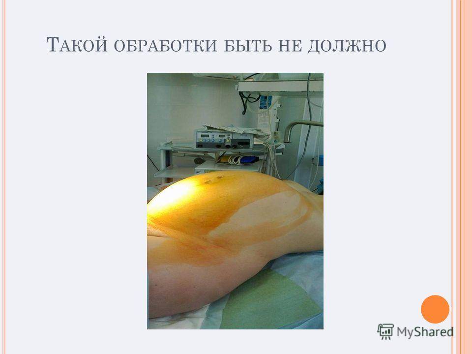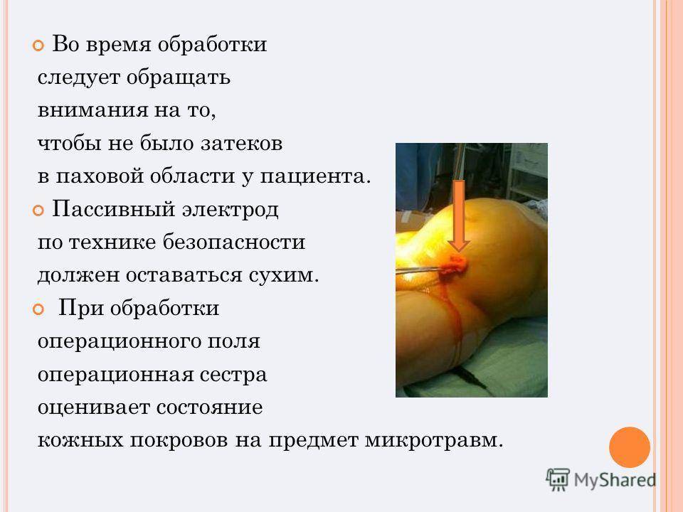 Во время обработки следует обращать внимания на то, чтобы не было затеков в паховой области у пациента. Пассивный электрод по технике безопасности должен оставаться сухим. При обработки операционного поля операционная сестра оценивает состояние кожных покровов на предмет микротравм.