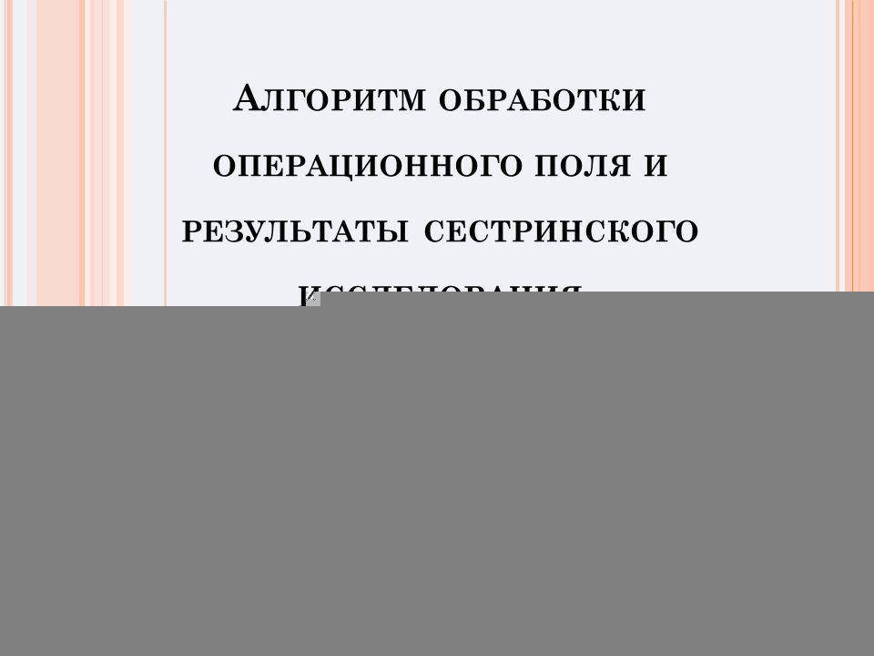 Презентация на тему: ” А ЛГОРИТМ ОБРАБОТКИ ОПЕРАЦИОННОГО ПОЛЯ И РЕЗУЛЬТАТЫ СЕСТРИНСКОГО ИССЛЕДОВАНИЯ Подготовила Старшая операционная медицинская сестра И.Б. Елфимова ГБУЗ ТО.” — Транскрипт: