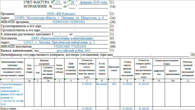 Образец заполнения счет-фактуры в электронном виде состоит из следующих данных: