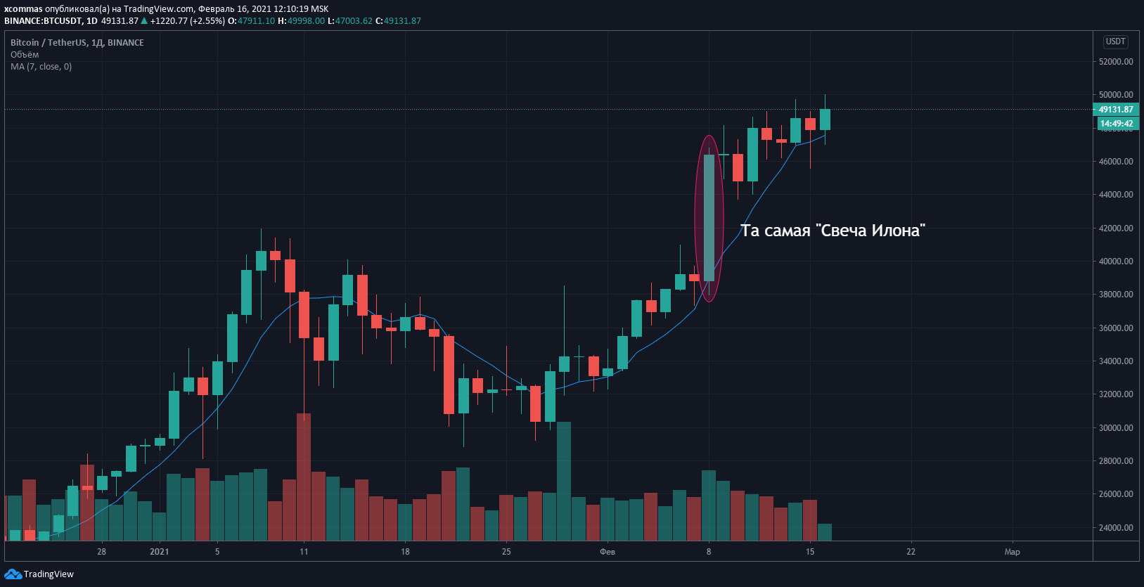 В отчете также упоминается так называемая «Свеча Илона» на прошлой неделе — самая большая дневная свеча на графике в истории BTC, которая была сформирована после объявления об инвестициях Tesla. Буквально за считанные часы цена Биткоина взлетела вверх на 18.5 процента. Рассматривая индикатор Average Spent Output Lifespan (ASOL) Биткоина — показатель, который измеряет средний возраст в днях всех израсходованных выходных транзакций — эксперты Glassnode пришли к выводу, что долгосрочные инвесторы использовали новости Tesla для фиксации прибыли.