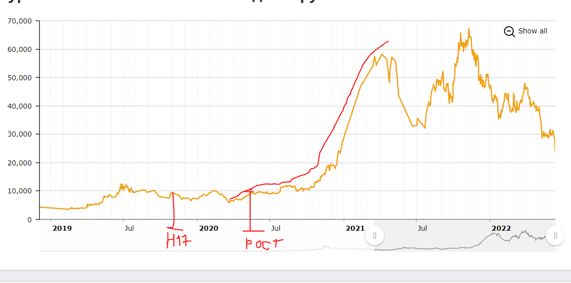 А кто-нибудь предполагал что биткоин может опуститься до тех значений которые были до ковида? Ведь он начал сильно расти при старте ковида, те есть, со старта СOVID прошло буквально 5–8 месяцев и рост биткоина пошел только вверх.