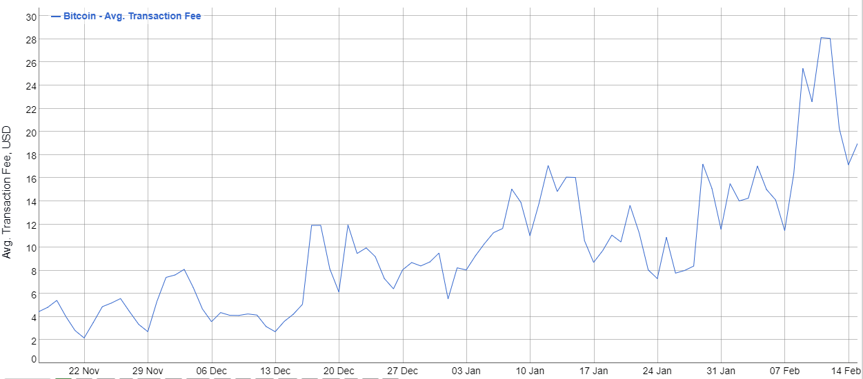 В последнее время их величина резко возросла. По данным платформы BitInfoCharts, средняя комиссия за транзакцию в сети BTC в данный момент составляет чуть меньше 20 долларов. В целом, накануне майнеры зарабатывали около 40 миллионов долларов за день, при этом комиссии составляли 13.47 процента от этой суммы.