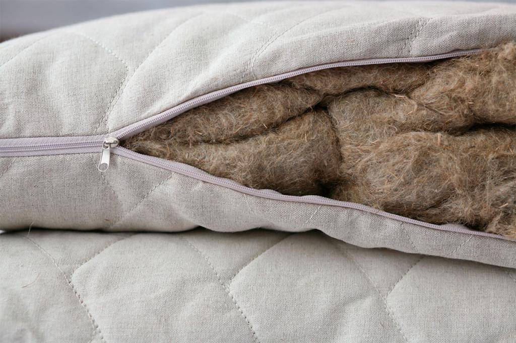 Подушка состоит из трех частей. Внутри находится распущенное льняное волокно, отличается мягкостью. Сверху содержится тонкий слой иглопробивного льна для придания прочности изделию. Волокно надевают в плотный чехол, изготовленный из этого же растения.