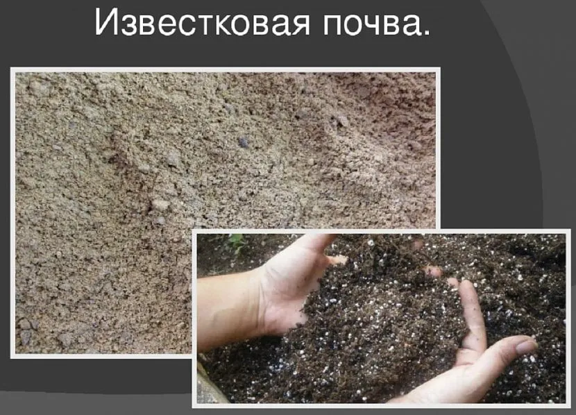 Известковую землю относят к обедненным типам грунта. У биологической массы светло-коричневый цвет. В структуре мало гумуса и много мелких камней, поэтому всегда рассыпается. Почва быстро нагревается и стынет, плохо отдает растениям минеральные вещества. Культуры развиваются очень медленно, из-за дефицита питательных ингредиентов и низкой кислотности всегда желтеет листва.