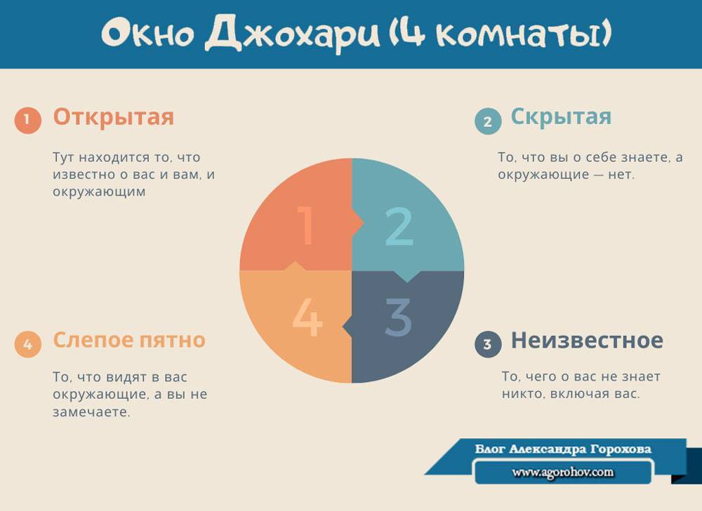 Этот метод разработали 2 психолога, которых зовут Джо и Харри. Суть заключается в том, что у вас есть слепые пятна относительно оценки самих себя. Например, вы можете в упор не замечать свои сильные стороны или закрывать глаза на слабые.