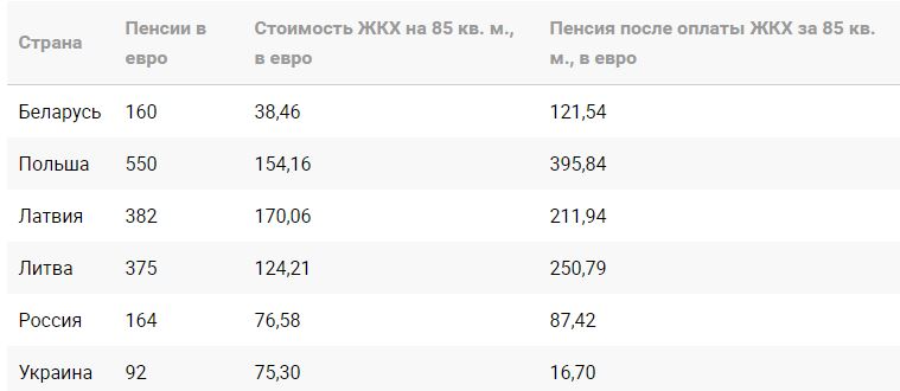 Таблица подтверждает, что услуги ЖКХ в Беларуси в самом деле дешевы. Однако для наших западных соседей по бывшему соцлагерю дорогая коммуналка проблемой, на самом деле, не является. Даже после оплаты за довольно просторную квартиру в 85 квадратов, у них остается достаточная сумма. В этом отношении российским пенсионерам значительно хуже, а для одинокого украинского пенсионера трёхкомнатная квартира в 85 кв. м. – непозволительная роскошь.
