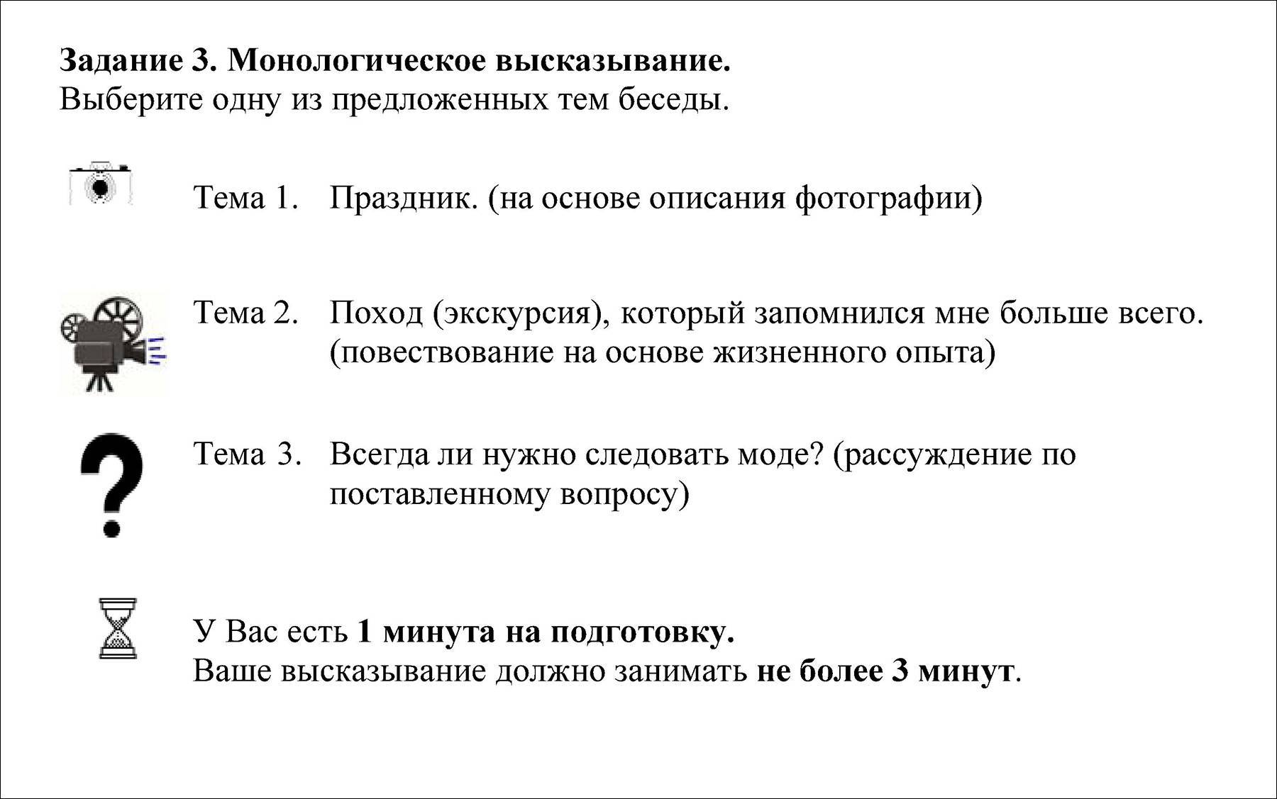 В третьем задании вам даётся карточка с тремя темами для монолога. Выбрать нужно одну.
